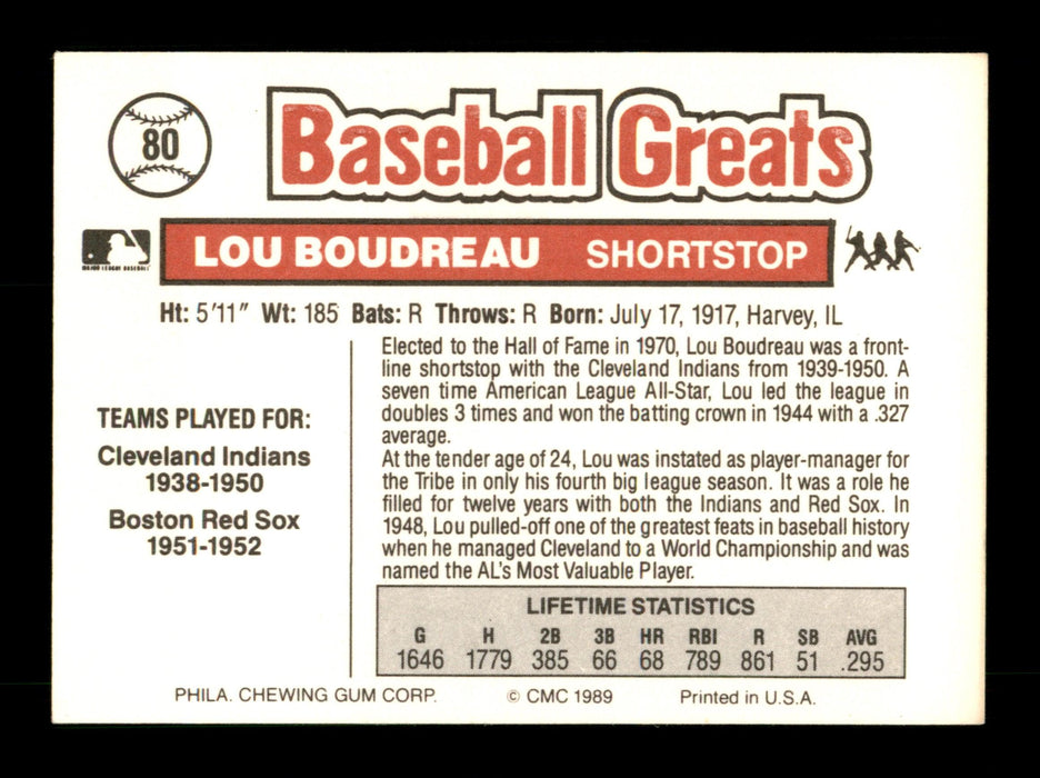 This is a 1989 Swell Baseball Greats Card #80 that has been hand signed by Lou Boudreau. This item is guaranteed to pass any third party authentication company including Beckett, PSA/DNA and JSA authentication.