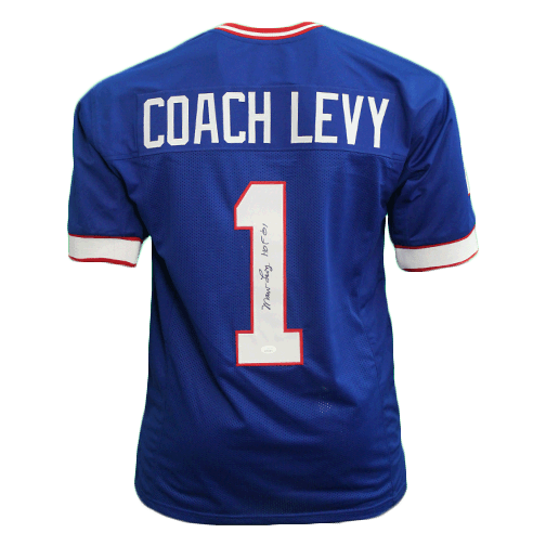 - A professional style blue custom replica football jersey autographed by Coach Marv Levy with HOF 01 Inscription and authenticated by Beckett