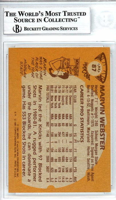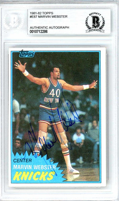 This is a 1981-82 Topps Card #87 that has been hand signed by Marvin Webster. It has been certified authentic by Beckett Authentication (BAS) and comes encapsulated in their tamper-proof holder.