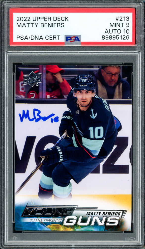 This is a 2022 Upper Deck Young Guns Rookie Card #213 that has been hand signed by Matty Beniers. The condition of this card was graded a Mint 9 by PSA. The condition of the signature was graded a Gem Mint 10 by PSA/DNA. It has been certified authentic by PSA/DNA and comes encapsulated in their tamper-proof holder.