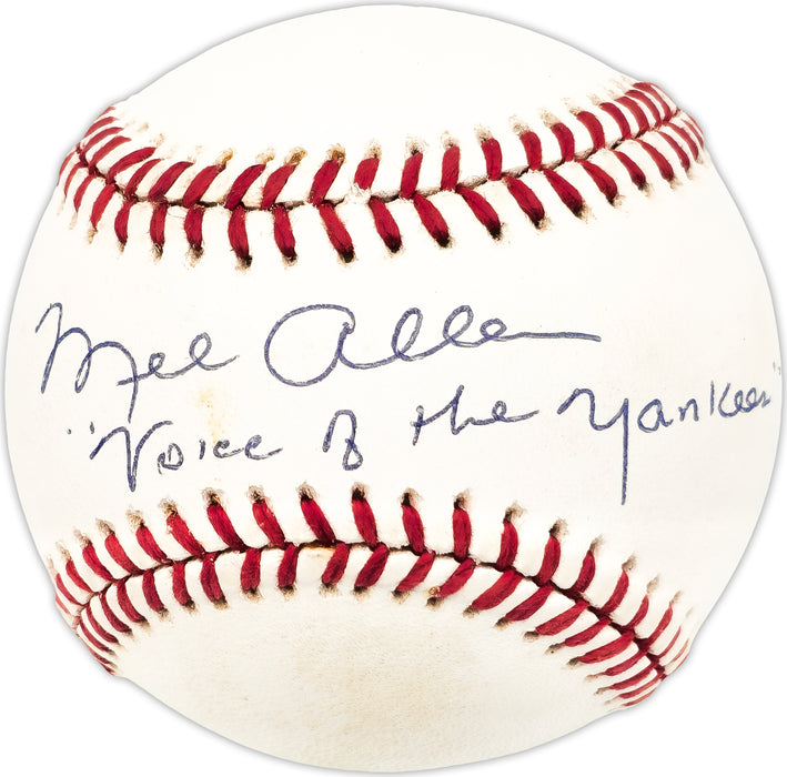 This is an Official American League Baseball that has been hand signed by Mel Allen. This item was inscribed "Voice of the Yankees." There is toning in the item as shown. This item has been certified authentic by JSA and comes with their tamper-proof hologram and matching certificate of authenticity.