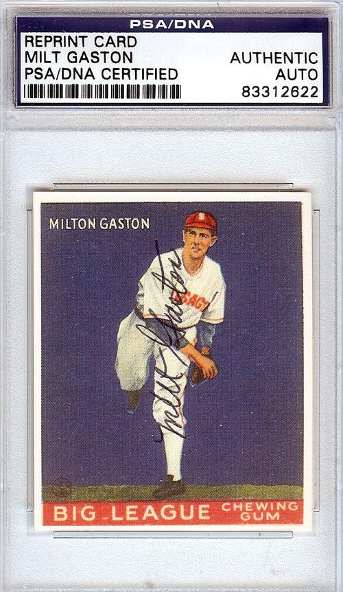 This is a 1933 Goudey Reprint Card that has been hand signed by Milt Gaston. It has been certified authentic by PSA/DNA and comes encapsulated in their tamper-proof holder.