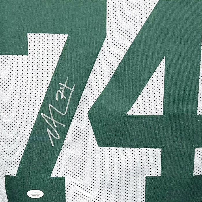 Our Nick Mangold New York White Signed Jersey proudly displays the Jets white and green for you and your gameday guests. Mangold's John Hancock is in the number 74 beneath his nameplate. The jersey comes with a Certificate of Authenticity and a tamper-proof sticker from James Spence Authentication (JSA) so you know it's genuine. RSA also provides a 100% money-back guarantee in case anything happens during the verification or shipping process.
