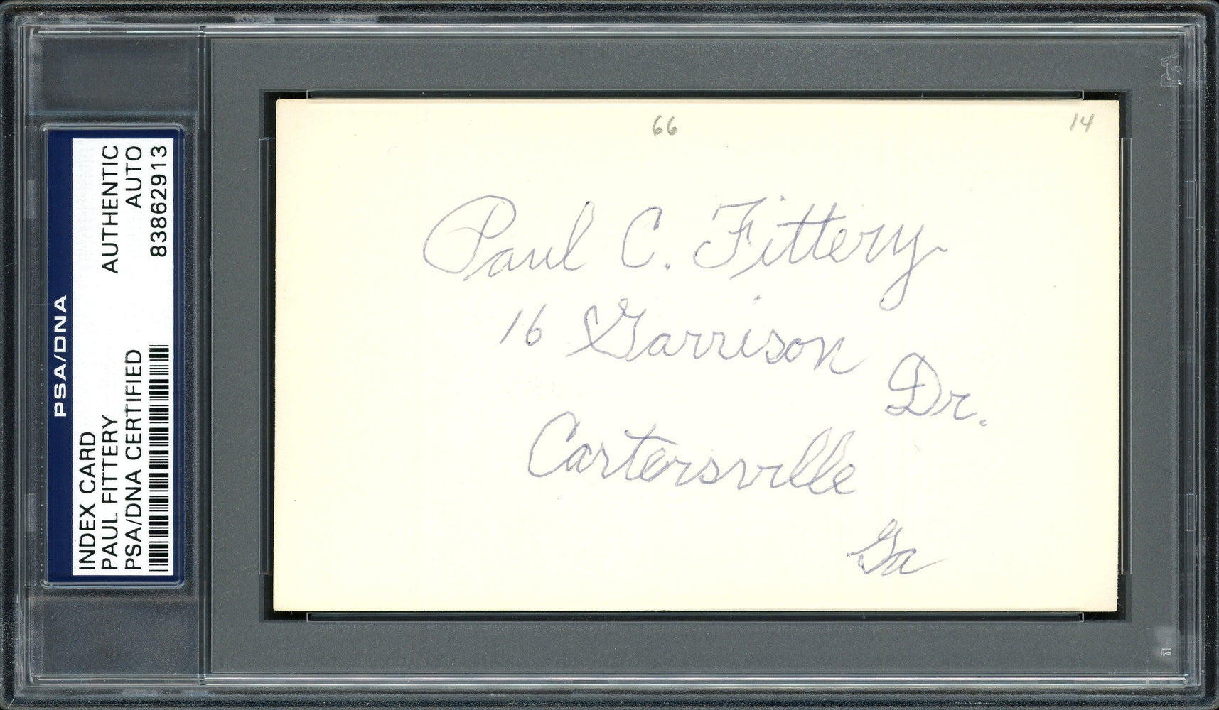 This is a 3x5 Index Card that has been hand signed by Paul C. Fittery. It has been certified authentic by PSA/DNA and comes encapsulated in their tamper-proof holder.