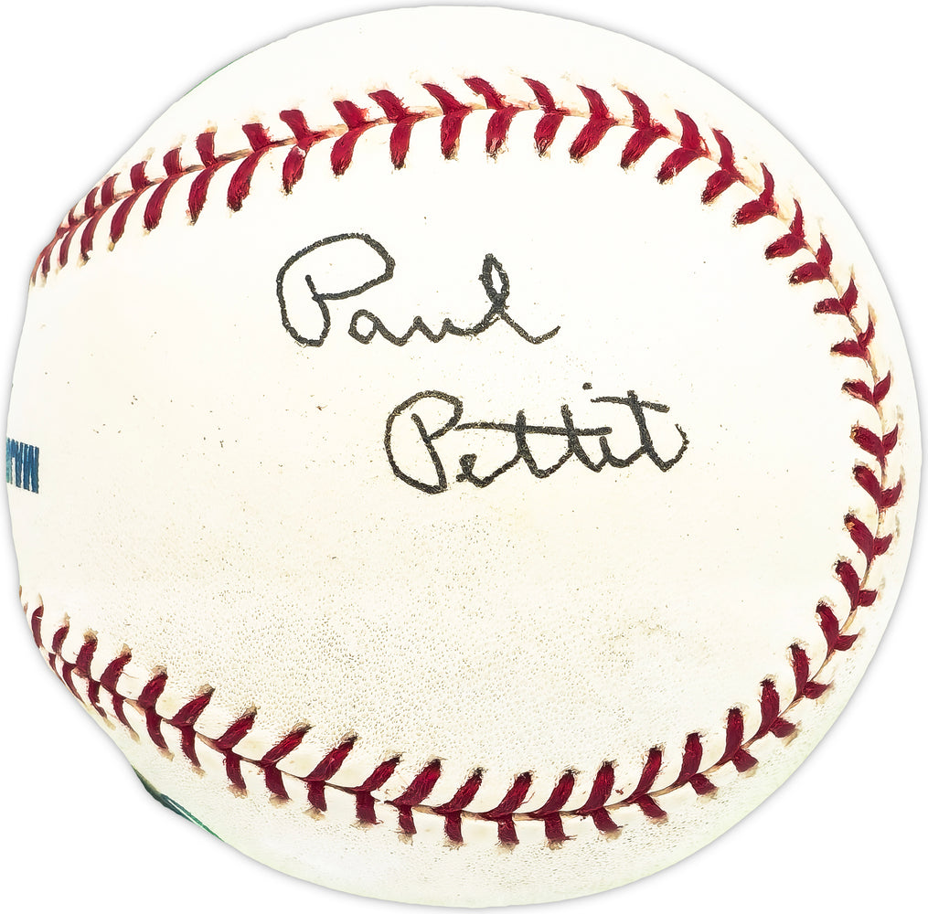 This is an Official MLB Baseball that has been hand signed by Paul Pettit. There is toning in the item as shown. This item has been certified authentic by Beckett Authentication (BAS) and comes with their tamper-proof QR Code hologram that can be verified on the Beckett-authentication.com.
