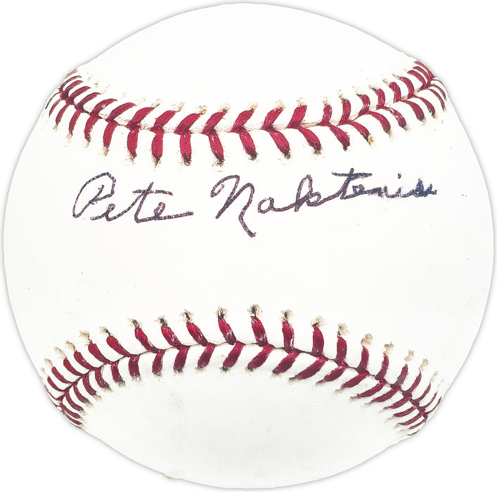 This is an Official MLB Baseball that has been hand signed by Pete Naktenis. This item has been certified authentic by Beckett Authentication (BAS) and comes with their tamper-proof QR Code hologram that can be verified on the Beckett-authentication.com.
