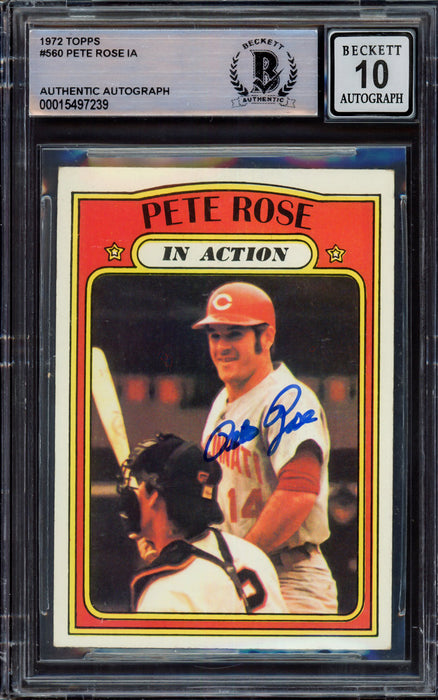 This is a 1972 Topps In Action Card #560 that has been hand signed by Pete Rose. The condition of the signature was graded a Gem Mint 10 by Beckett BAS. It has been certified authentic by Beckett Authentication Services (BAS) and comes encapsulated in their tamper-proof holder.
