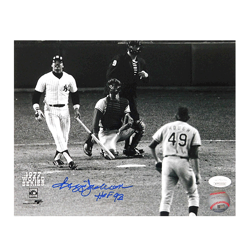 - A custom glossy, high-quality 300dpi 8x10 print of Reggie Jackson batting for the New York Yankees during the 1977 World Series, autographed by Jackson with HOF 1993 inscription and authenticated by JSA