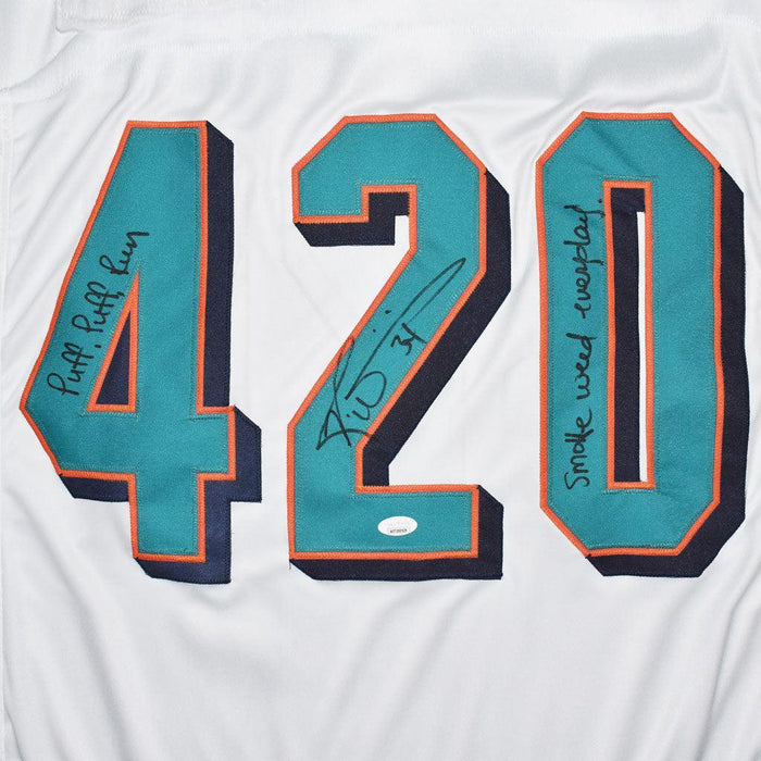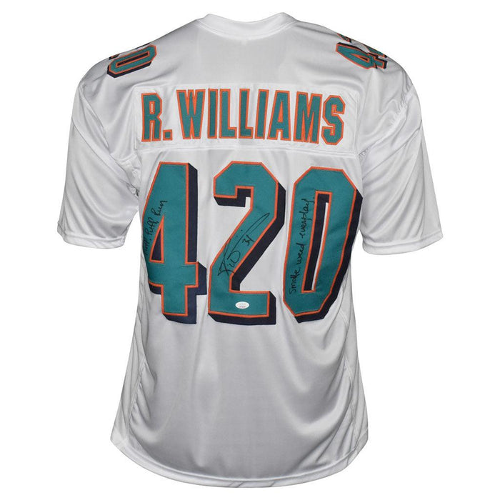 Ricky Williams Signed 2-Inscription Inscription Miami Pro 420 White Football Jersey (JSA)