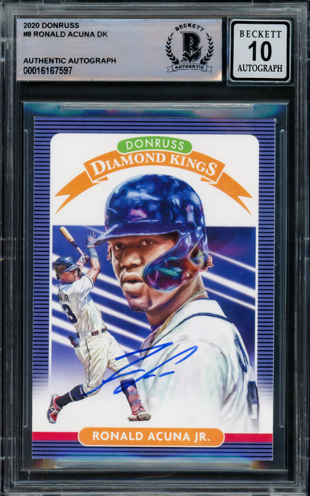 This is a 2020 Donruss Diamond Kings Card #8 that has been hand signed by Ronald Acuna Jr. The condition of the signature was graded a Gem Mint 10 by Beckett BAS. It has been certified authentic by Beckett Authentication Services (BAS) and comes encapsulated in their tamper-proof holder.