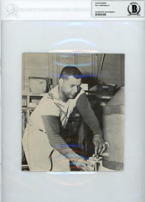 This is a 6x6.5 Magazine Page Photo that has been hand signed by Roy Campanella. This is a pre-accident signature. It has been certified authentic by Beckett Authentication (BAS) and comes encapsulated in their tamper-proof holder.
