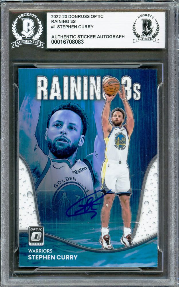 This is a 2022-23 Donruss Optic Raining 3's Card #1 that has been hand signed by Stephen Curry. The autograph is on a sticker which was placed on this card. There is an imperfection in the signature as shown. It has been certified authentic by Beckett Authentication Services (BAS) and comes encapsulated in their tamper-proof holder.