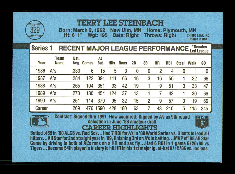 This is a 1991 Donruss Card #329 that has been hand signed by Terry Steinbach. This item is guaranteed to pass any third party authentication company including Beckett, PSA/DNA and JSA authentication.