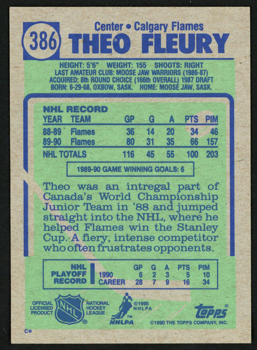 This is a 1990-91 Topps Card #386 that has been hand signed by Theoren "Theo" Fleury. This item is guaranteed to pass any third party authentication company including Beckett, PSA/DNA and JSA authentication.