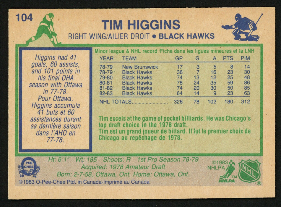 Tim Higgins Autographed 1983-84 O-Pee-Chee Card #104 Chicago Blackhawks SKU #150216