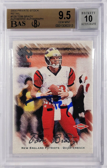 This is a 2000 Pacific Private Stock Retail Rookie Card #128 that has been hand signed by Tom Brady. The condition of this card was graded a Gem Mint 9.5 by BGS. The condition of the signature was graded a Gem Mint 10 by Beckett BAS. This is a limited edition item that has been serial numbered #78/650. It has been certified authentic by Beckett Authentication Services (BAS) and comes encapsulated in their tamper-proof holder.