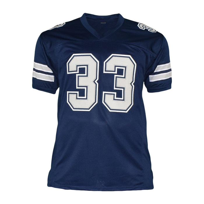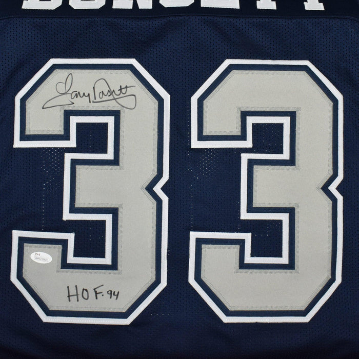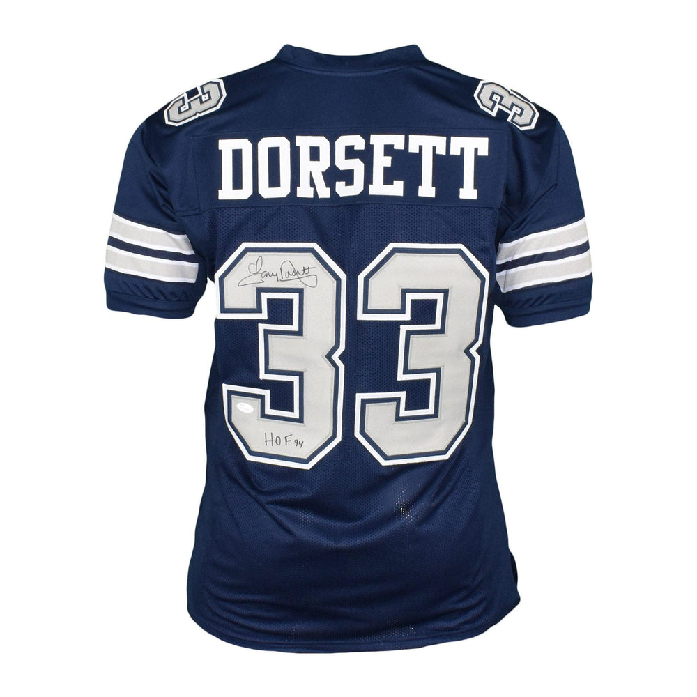 - A professional-style blue custom replica football jersey autographed by Tony Dorsett with HOF 99 inscription and authenticated by JSA