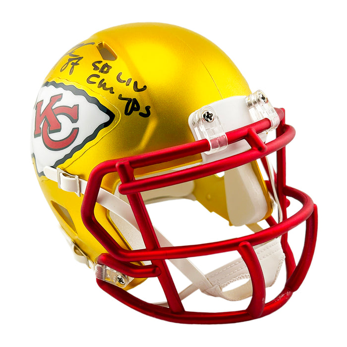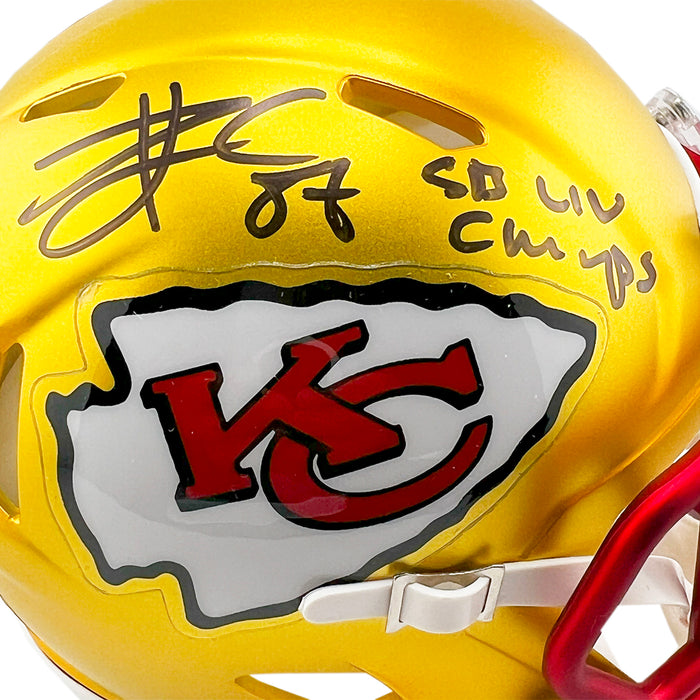 Travis Kelce Signed SB LIV Champs Inscription Kansas City Chiefs Blaze Mini Football Helmet (Beckett)