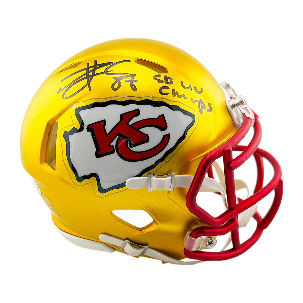 - Speed mini NFL football helmet autographed by Travis Kelce with SB LIV Champs inscription and authenticated by Beckett