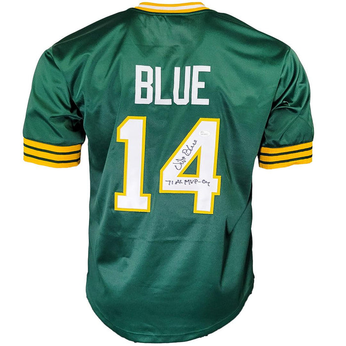 - A professional style green custom replica baseball jersey autographed by Vida Blue with 71 AL MVP CY inscription and authenticated by JSA
