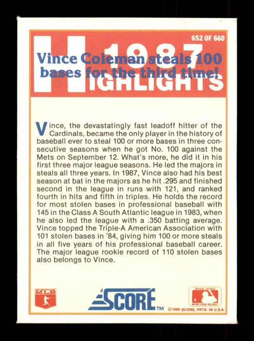 Vince Coleman Autographed 1988 Score Card #652 St. Louis Cardinals SKU #188439