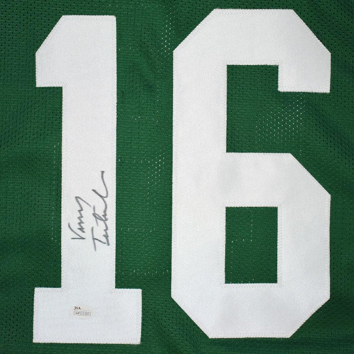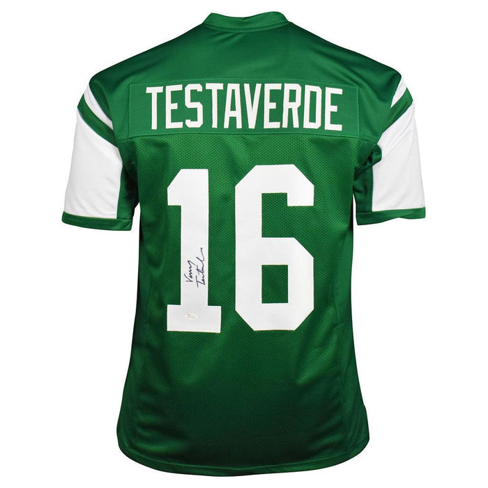 - A professional style green custom replica football jersey autographed by Vinny Testaverde and authenticated by JSA