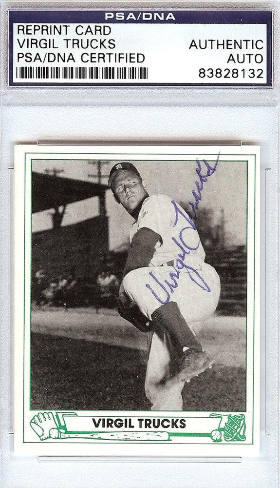 This is a 1946 Play Ball Reprint Card #6 that has been hand signed by Virgil Trucks. It has been authenticated by PSA/DNA and comes encapsulated in their tamper-proof holder.