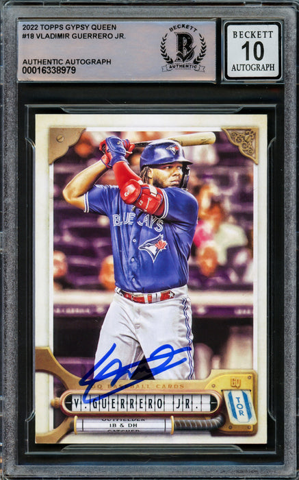 This is a 2022 Topps Gypsy Queen Card #18 that has been hand signed by Vladimir Guerrero Jr. The condition of the signature was graded a Gem Mint 10 by Beckett BAS. It has been certified authentic by Beckett Authentication Services (BAS) and comes encapsulated in their tamper-proof holder.