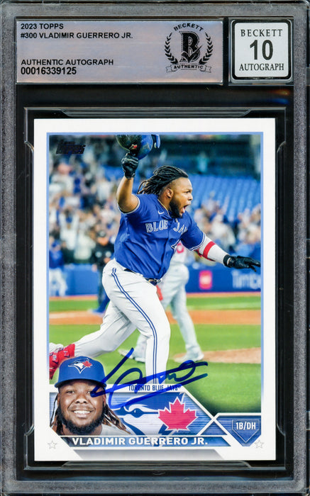This is a 2023 Topps Card #300 that has been hand signed by Vladimir Guerrero Jr. The condition of the signature was graded a Gem Mint 10 by Beckett BAS. It has been certified authentic by Beckett Authentication Services (BAS) and comes encapsulated in their tamper-proof holder.