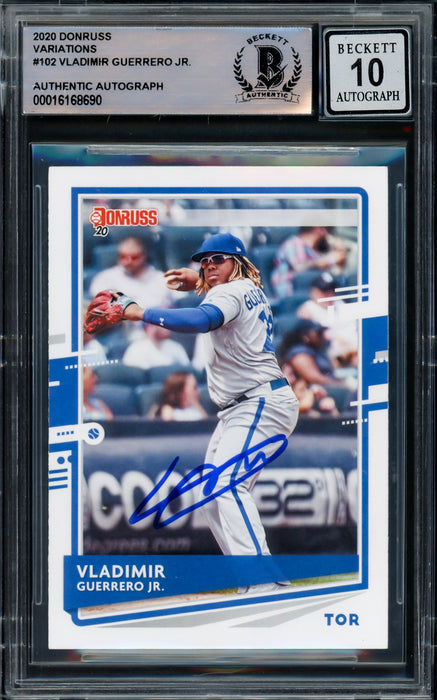 This is a 2020 Donruss Card #102 that has been hand signed by Vladmir Guerrero Jr. The condition of the signature was graded a Gem Mint 10 by Beckett BAS. It has been certified authentic by Beckett Authentication Services (BAS) and comes encapsulated in their tamper-proof holder.
