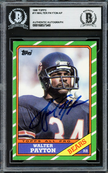 This is a 1986 Topps Card #11 that has been hand signed by Walter Payton. It has been certified authentic by Beckett Authentication Services (BAS) and comes encapsulated in their tamper-proof holder.