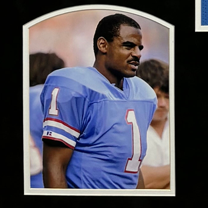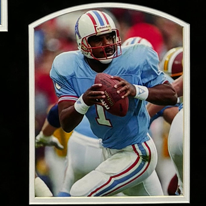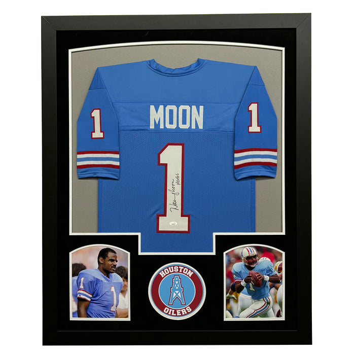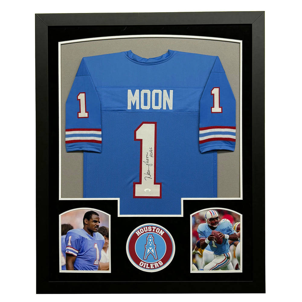 Warren Moon professionally framed hand signed, custom stitched football jersey with premium suede matte, wood frame and plexiglass cover.