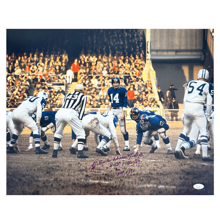 Y.A. Tittle Signed 4 TD's, 10/20/63, HOF 71 Inscription Pose 11 Football 16x20 Photo (JSA)