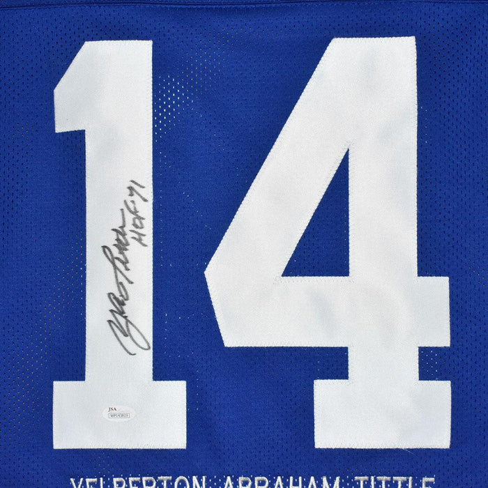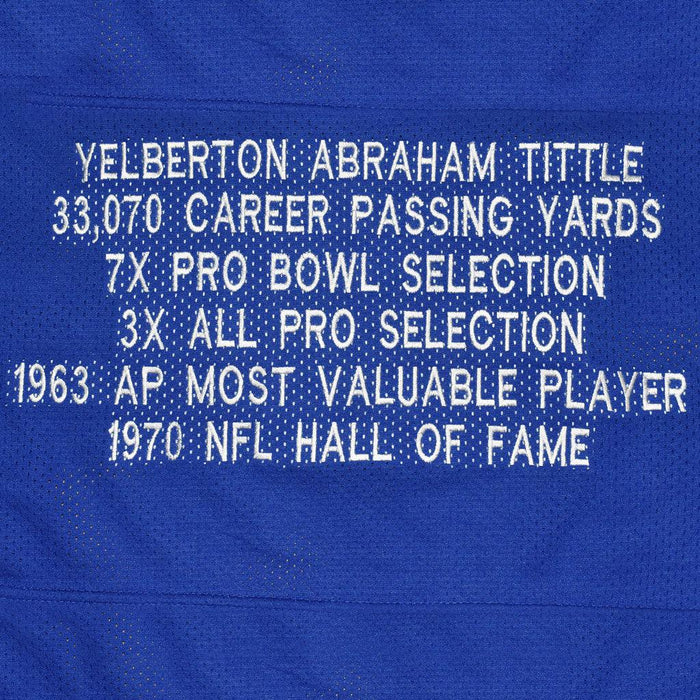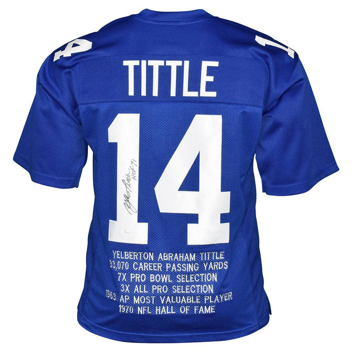 YA Tittle Signed HOF 71 Inscription New York Pro Blue Stats Football Jersey (JSA)